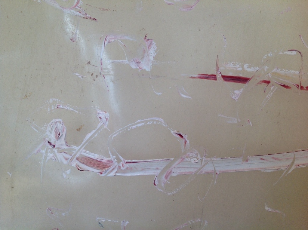 Layered acrylic paint and pheasant feathers are applied to a translucent plastic surface, to portray the beauty and evental death of these birds. The work is vivid with red, brown, and white.