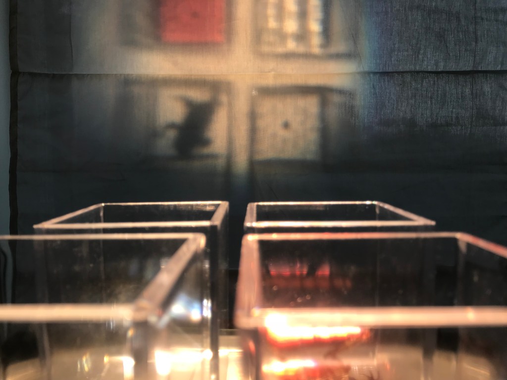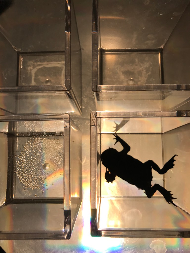 - Frog: Four transparent plastic containers on the projector’s surface held a flattened roadkill frog and liquids that rippled slightly due to the projector’s ventilator. The projection oscillated between water as an element the frog would naturally thrive in and the unsettling reality of its lifeless form under quasi-scientific observation.