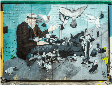 Lone Star Swan figures in Chapter 1 in Donna Haraway’s book Staying with the Trouble. He was a homeless man living in the Mission District in San Francisco. A mural Bird Man of the Mission depicts him feeding urban pigeons, his companions and friends in street life.